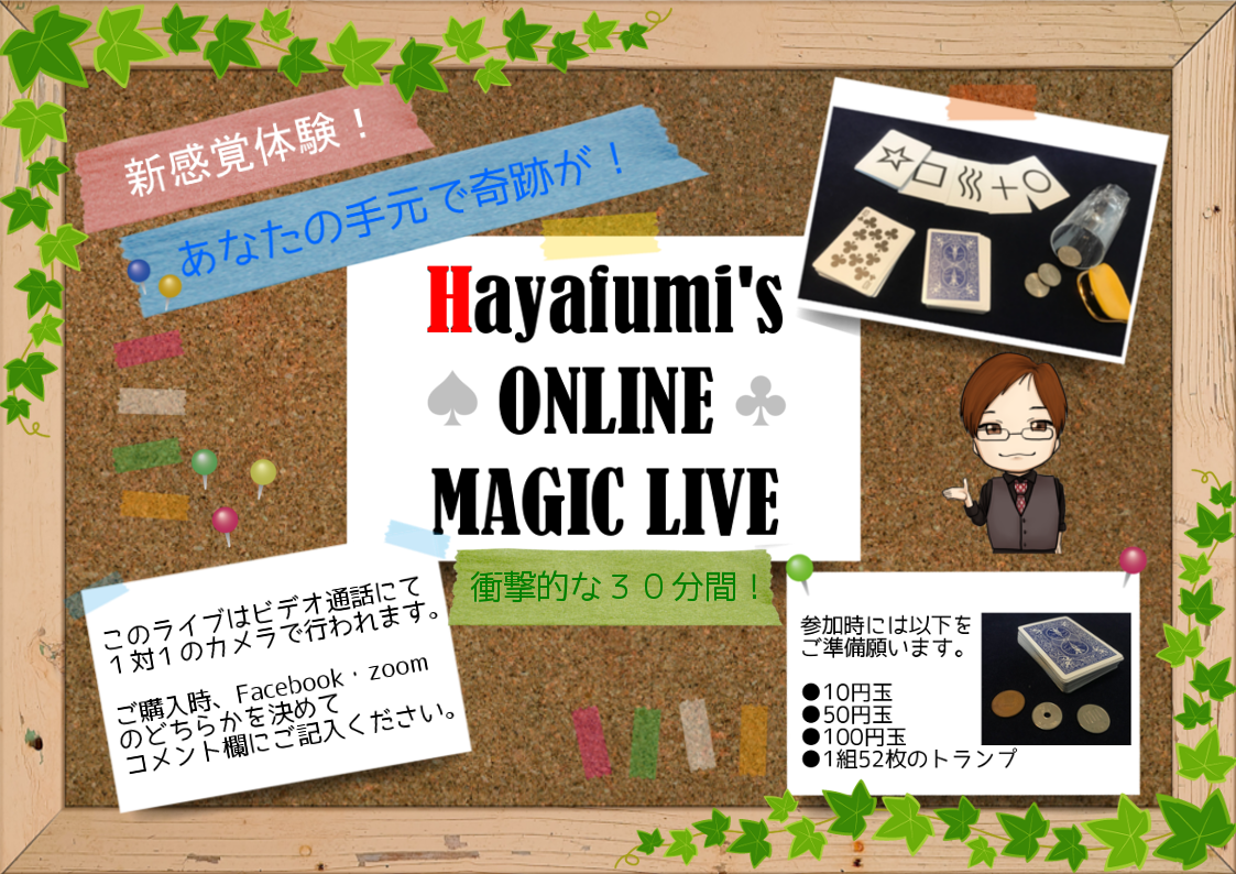 ![]() オンラインマジックライブは、ビデオ通話で行われます。 ※通信にかかる費用や容量に関しては、一切責任を負いかねますのでご了承ください。 観客は1組・カメラは1台のみで行う、完全なプライベートライブ、といったイメージです。 そのため、「Facebook」「zoom」のいずれかのツールにて行います。 ※「Facebook」について、予め友達登録を必要とする場合があります。 Youtubeなどの動画で多数相手のマジックライブをご覧になるのとは違い 中には、ご自身でトランプを操作して奇跡が起こる等の演目もございます。 カメラ越しに何名いらっしゃっても構いませんが、同画面をご覧になることを考慮すると 1~4名ほど(1家族)を目安とさせていただいております。 通常のマジックライブでは決して体験できない形を、ぜひお楽しみいただければと思います。 詳細はコチラを御覧ください。 |