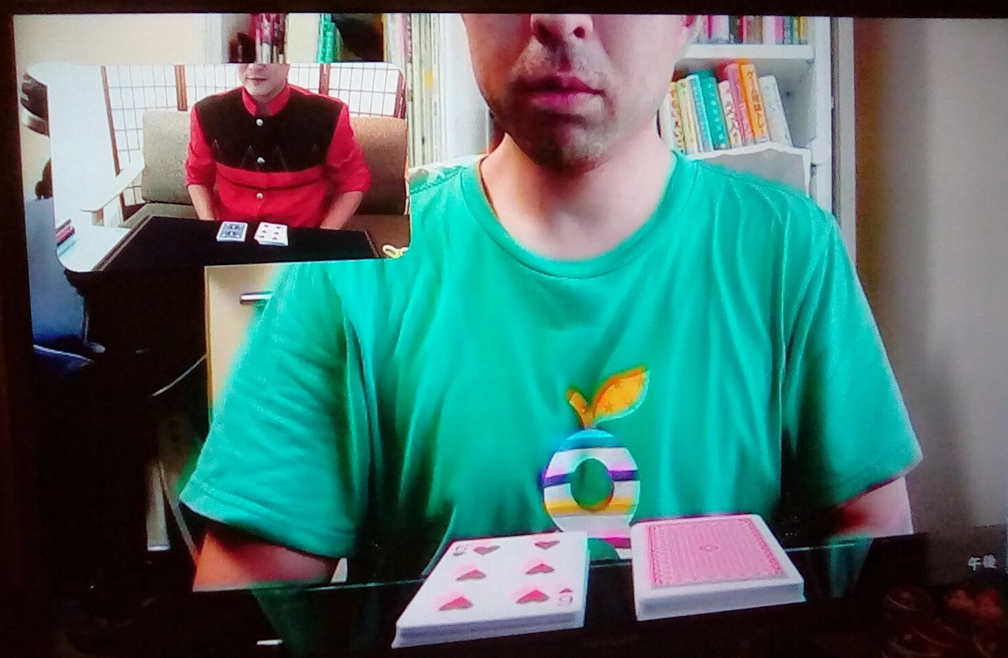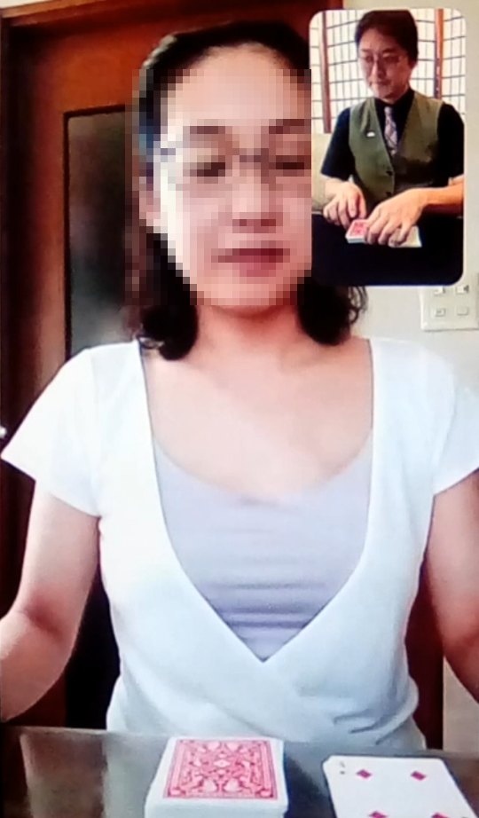 皆様のご用意したトランプを使って、同じような動きをして操作をしていただく場面がございます。 それに伴い、こちらの映像も見えて、皆様も手元も映るような環境ですと、滞りなくライブを進めることが出来ます。 皆様のトランプを扱うシーンは、下の写真のようなイメージです。 ![]() ビデオ通話を行う端末は、カメラの向きを動かすことが可能な スマートフォンかノートパソコンを推奨いたします。 また、テレビ画面等の大画面にミラーリングできる方は、ミラーリングも行うと見やすくなります。 |